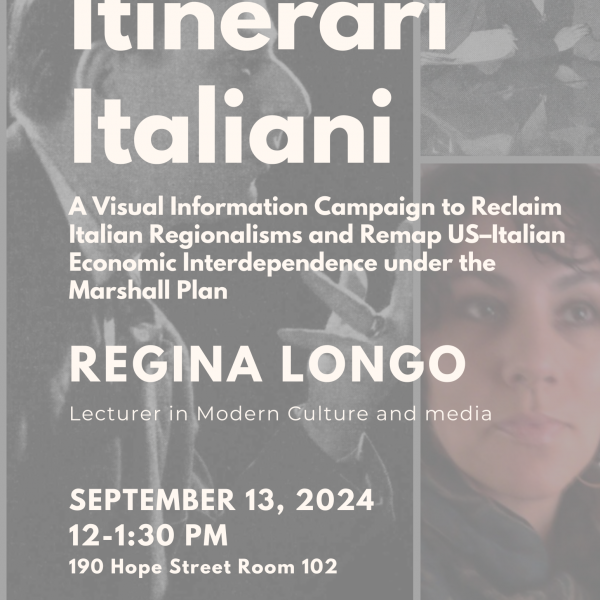 Please join the Italian Studies Department for a colloquium with Cosette Bruhns Alonso on September 12th from 12-1:30pm. The lecture will be held in person at 190 Hope Street Room 102 as well as on Zoom. The zoom link will be provided upon request. Please contact Italian_Studies@brown.edu with questions or to receive access to the zoom link.