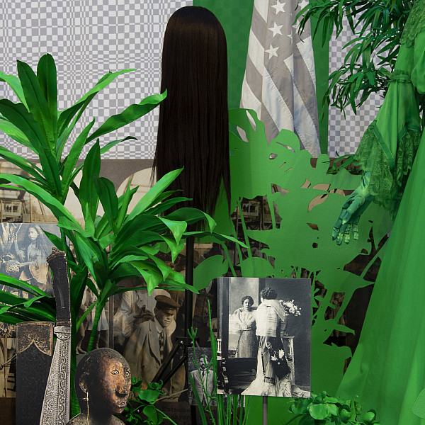 Stephanie Syjuco, “Dodge and Burn (Visible Storage),” 2019, installation detail. Wooden platform, digital photos and printed vinyl on lasercut wood, chromakey fabric, printed backdrops, seamless paper, artificial plants, mixed media.