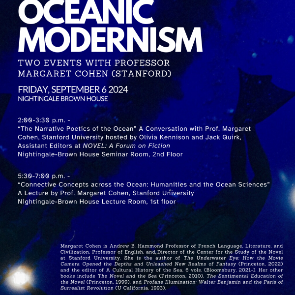 Margaret Cohen is Andrew B. Hammond Professor of French Language, Literature, and Civilization, Professor of English, and Director of the Center for the Study of the Novel at Stanford University. She is the author of The Underwater Eye: How the Movie Camera Opened the Depths and Unleashed New Realms of Fantasy (Princeton, 2022) and the editor of A Cultural History of the Sea, 6 vols. (Bloomsbury, 2021-). Her other books include The Novel and the Sea (Princeton, 2010), The Sentimental Education of the Novel (Princeton, 1999), and Profane Illumination: Walter Benjamin and the Paris of Surrealist Revolution (U California, 1993).