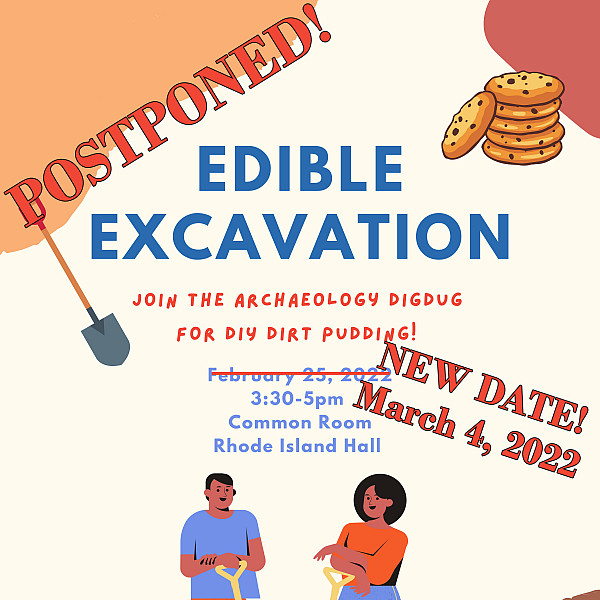 The DigDUG (Archaeology Department Undergraduate Group) invites ALL STUDENTS to stop by Rhode Island Hall on February 24th between 2:30 and 3:30pm. Relax on some comfy couches and enjoy a study break with tea, coffee, and some snacks. Everyone welcome! If you’ve ever taken (or even considered taking) an ARCH course or are interested in the ancient world, come say hi!